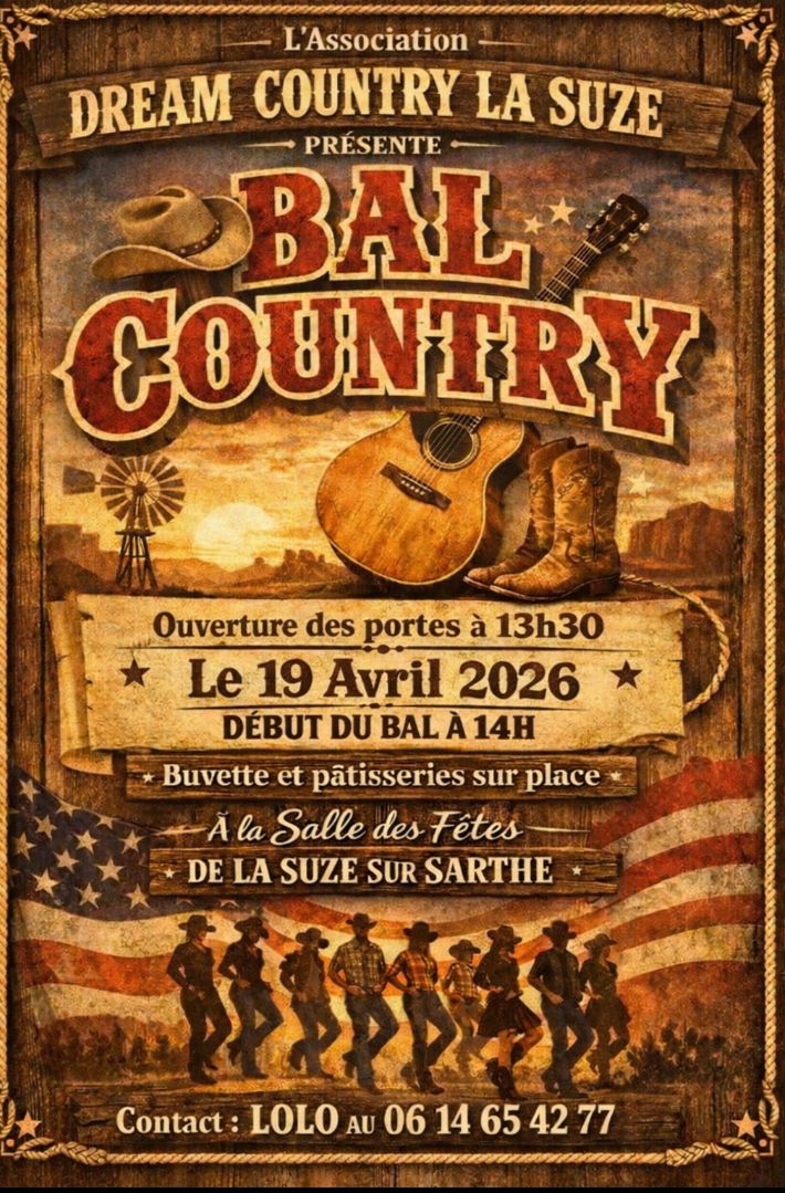 Banniere, Info Bal du 19 avril 2026 21 janvier 2026 Suite à l’annulation de notre bal workshop du samedi 18 avril 2026, nous proposons un bal country le dimanche 19 avril 2026 à la salle des fêtes de la Suze dès 14h (ouverture des portes à 13h30). Précédent Soirée Chocolat de Noel du 16 décembre 2025 Vous aimerez aussi Bal Dream Country le 14 octobre 2023 avec worshops! Réservez vos places! 16 novembre 2022 Bal country et workshop 8 novembre 2023 Bienvenue à nos nouveaux adhérents! 16 novembre 2022